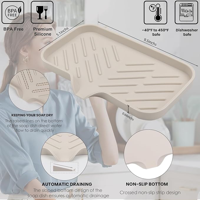 YASMEN Silicone Bathroom Soap Dishes, Sink Sponge Holder for Kitchen, Rubber Soap Dish with Drain, Shower Soap Sponge Tray, Sink or Counter Organizer, for Bar Soap, Bottle, Dish Soap Dispenser-Tapioca