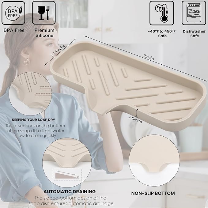 YASMEN Silicone Bathroom Soap Dishes, Sink Sponge Holder for Kitchen, Rubber Soap Dish with Drain, Shower Soap Sponge Tray, Sink or Counter Organizer, for Bar Soap, Bottle, Dish Soap Dispenser-Tapioca
