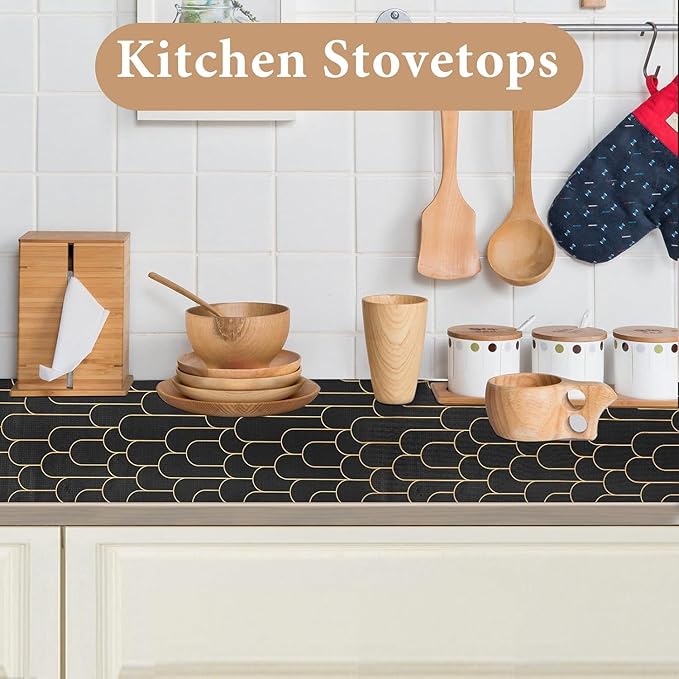 Shelf Liners for Kitchen Cabinets Drawer Liner 12in x 20FT Non Adhesive Black Gold Line Thickened Refrigerator Shelf Liner Paper Strong Easy to Clean for Tool Box with Knife and Tape Measure