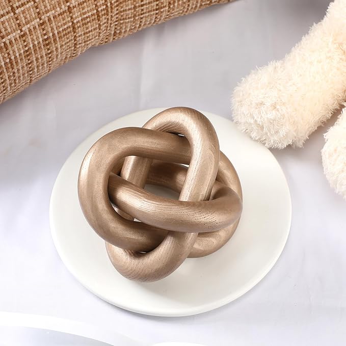3 Link Wood Knot Decor - Hand Carved Coffee Table Decoration, Boho Chain Link Decor, Modern Shelf, Rustic Objects for Home Living Room Bedroom(Champagne)