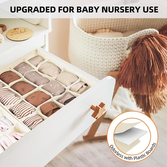 - 【SOLVE YOUR QUALITY CONCERNS】Maybe you noticed a strange smell in your drawers? Many organizer bins are made of cardboard, causing odors. Our Criusia drawer organizers use durable plastic boards wrapped in cationic cloth, making them 10 times more durable than non-woven fabric. They are odorless, ideal for baby nursery organization, and washable for a longer lifespan.