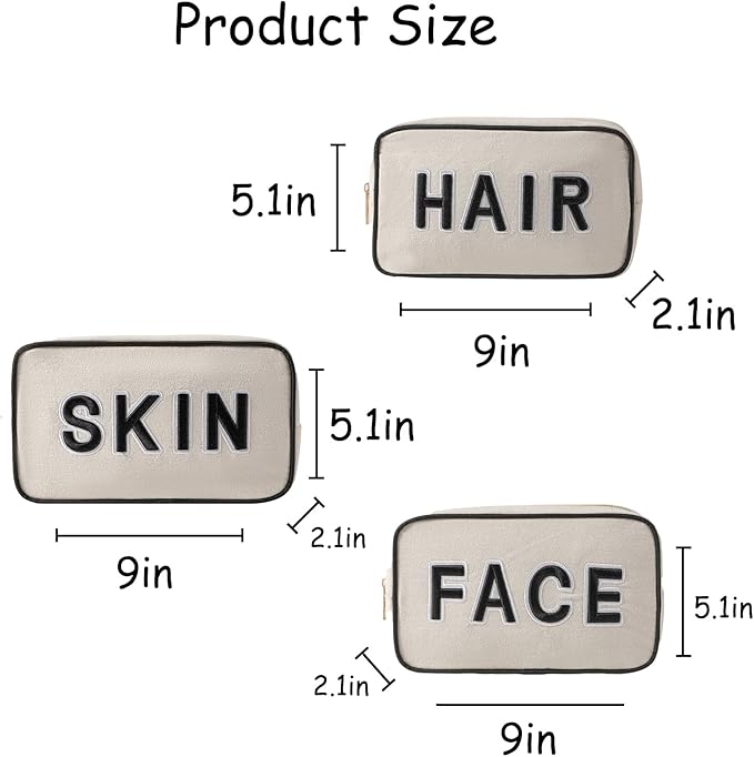 uekeboag 3Pcs Canvas Chenille Letter Makeup Bag Set, Small Travel Washable Organizer Bag for Purse with Zipper, Cute Personalized Gift Pouch For Women and Girls(Hair Skin Face)