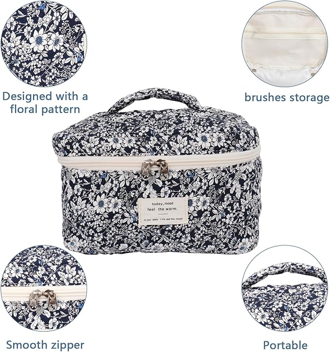 - ✅High-Quality Material: This travel cosmetic bag is made of cotton material, which is easy to clean, has been well- stitched and reinforced at all stress points. The double zipper is made of high-quality gold-plated alloy, which can make the makeup bag easier to pull and align neatly.