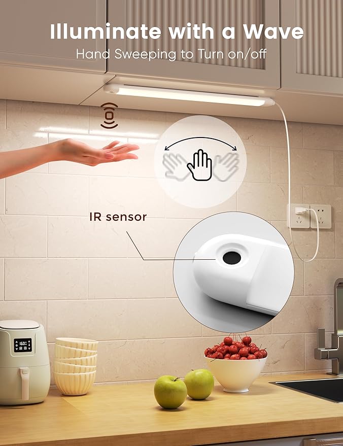 2 Pack Hand Wave Under Cabinet Lights, 16 Inch Plug in Dimmable Kitchen Counter Light Brightness Adjustable Over Sink Lighting, Super Bright LED Lights Motion Sensor Above Stove Lites Under Shelf Lamp