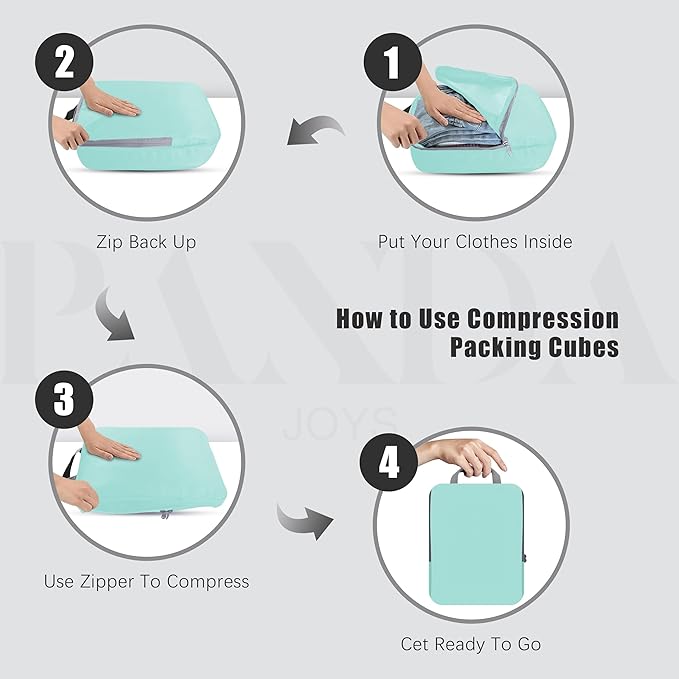 - ✈️Maximize Space with Innovative Compression - Unlock the secret to compact travel with our game-changing compression packing cubes. Featuring an additional outer zipper, these cubes are designed to compress your clothes similarly to a vacuum sealer's efficiency. Here’s how it works: fold and flatten your garments, zip up using the main zipper, and then compress the cube with the extra zipper, making sure to keep fabric clear for a smooth operation.