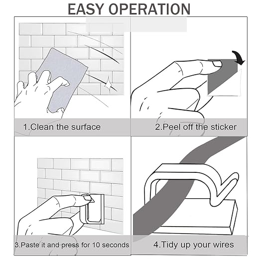 - Note Before Use: Clean the surfaces before attaching the wire clips to ensure that the mounting surfaces are free of dirt, dust, grease and wax. Stick it on and press firmly for 10 seconds, and use them after 2 hours for maximum adhesion.