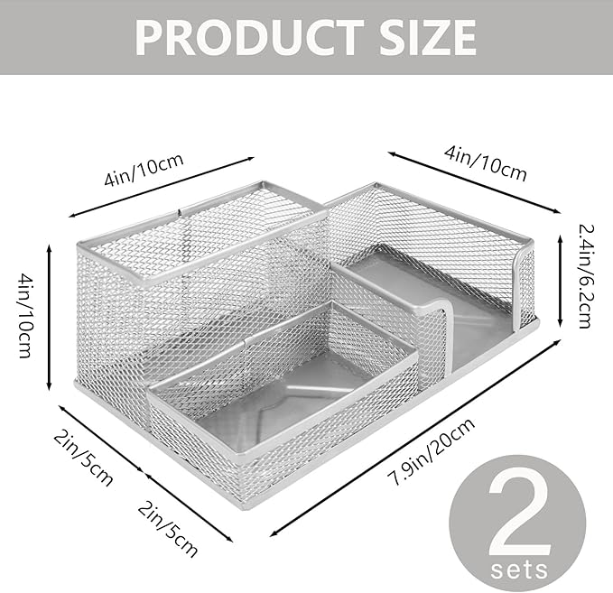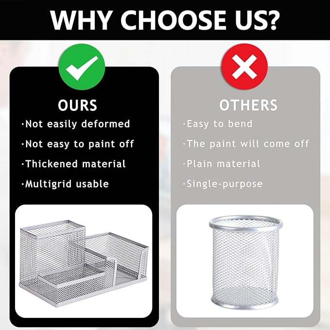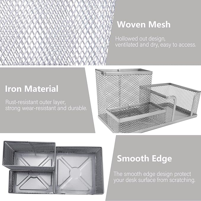 - 【Well Made Metal Material】 Crafted from sturdy metal wire, the desk pen organizer in the silver color is solid, non-fade and anti-bend. With the spacious compartments and solid construction, it ensures long-lasting use.