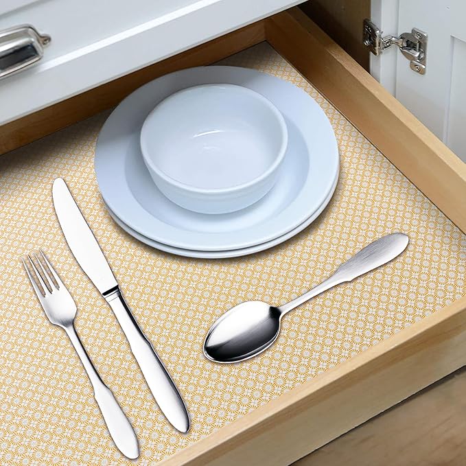 RAY STAR 12X120 Inch Shelf Liner for Kitchen Cabinets, Non-Adhesive Cabinet Liner Washable, PVC Drawer Liner for Dresser Non-Slip Bathroom (Yellow Circle)(4 Roll)
