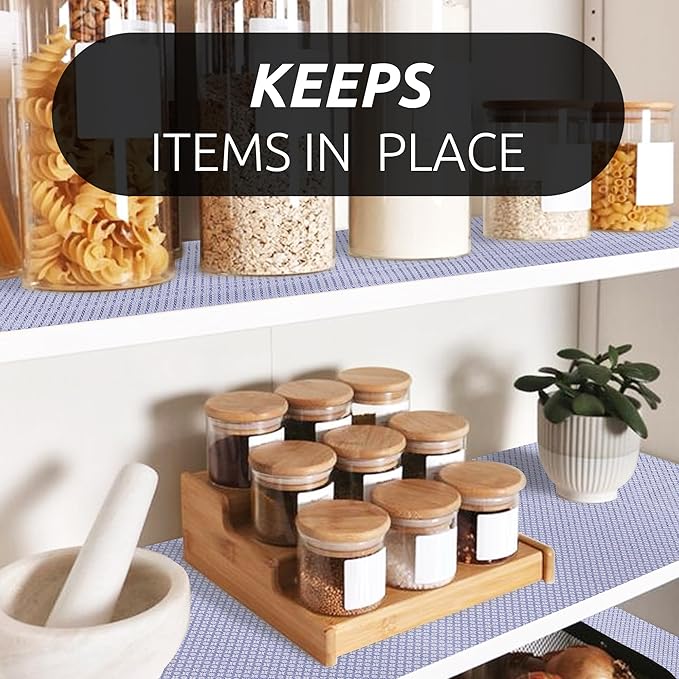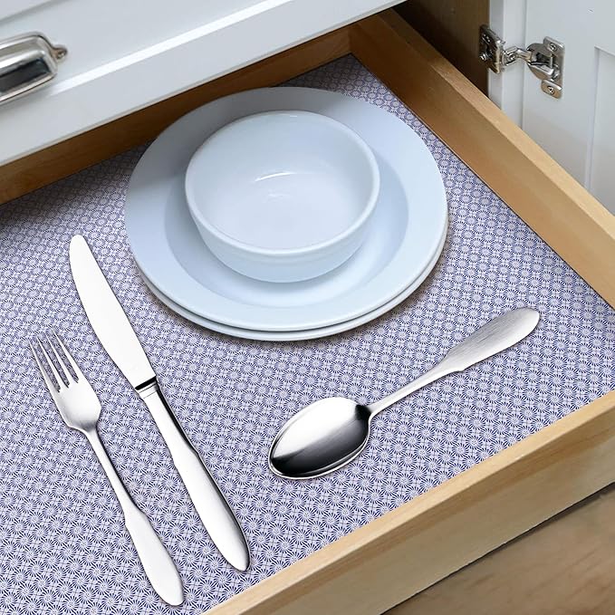 - PVC Material - These shelf liners are made by PVC material which is non-adhesive & non-slip. Non-adhesive drawer liner is reducing slip and bunch in your drawers or cabinet shelves, it will keep both the liner in place on surface s, as well as helps prevent items from moving.