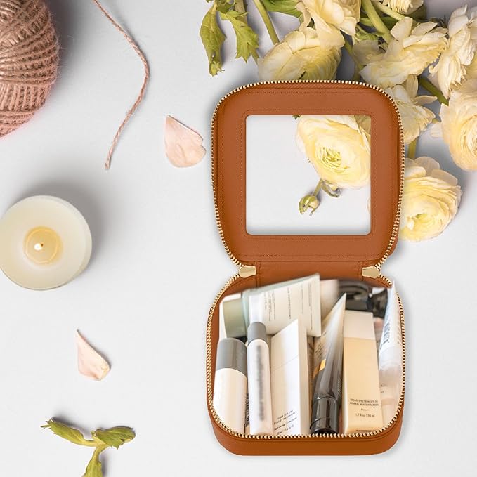 - 【ROOMY & STYLISH】 Measuring 5'' x 5'' x 2.1'', this makeup travel organizer embodies luxury and style. Its minimalist boxy design in a chic color exudes elegance; Crafted from exquisite Vegan leather and adorned with polished hardware