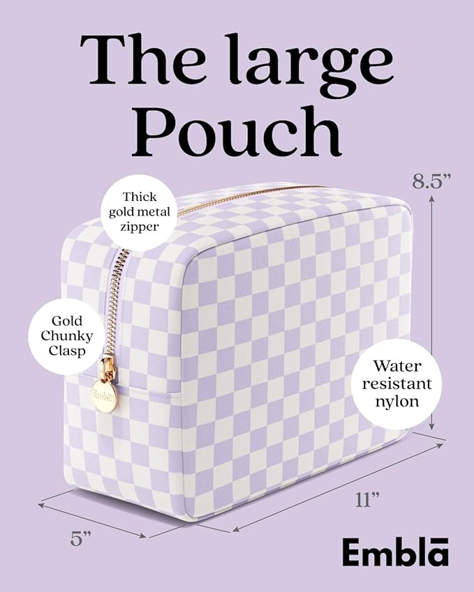 - TRAVEL + CUTE = EMBLA! - Our bags are THE trendy & preppy storage gifts! Simply pick your size (Mini, Large or XL) and start organizing all of your makeup, lipstick, hair stuff, snacks and jewelry accessories! Or use it as a clutch handbag, makeup brush holder, skin care bag, zippered carry case or coin purse wallet!