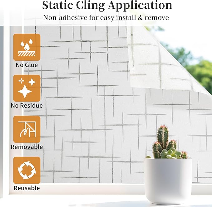 - EASY INSTALLATION – Window sticker privacy is super easy to install. The no glue, static cling application just takes a few minutes to apply. Frosted glass film is even easily removable for multiple uses and it doesn’t leave any sticky residue
