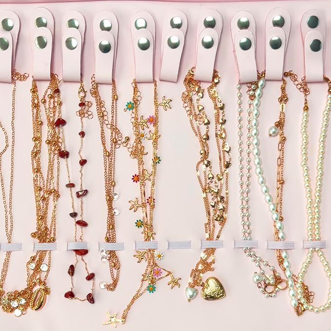- Easy to use: Inside the roll, there are 16 necklace/bracelets holders with button design. Just hang your necklaces or bracelets on the holder and roll it up and use the hook-and-loop as closure