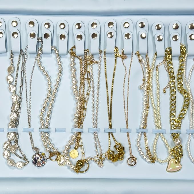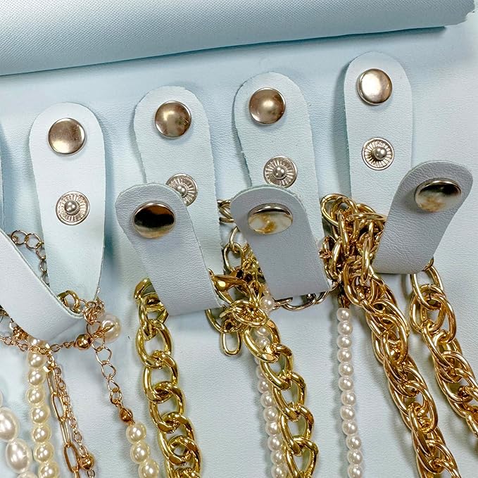- Easy to use: Inside the roll, there are 16 necklace/bracelets holders with button design. Just hang your necklaces or bracelets on the holder and roll it up and use the hook-and-loop as closure
