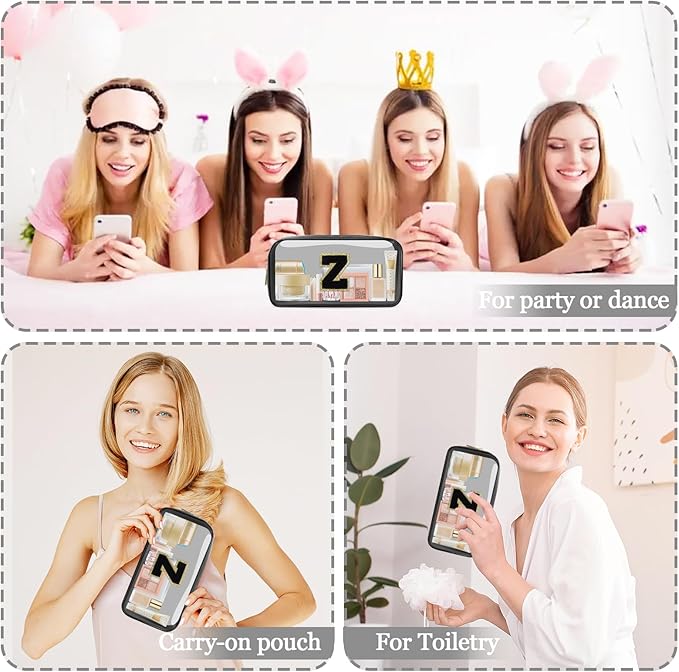 - 【Personalized Letter Design】The Clear makeup Pouch is designed with stitched glitter Chenille letters, you don't have to worry about it falling off. The unique Chenille 26 letter design, sparkling gold borders, and cute monogram patches have a strong personalized style, making your makeup bag the focus of attention