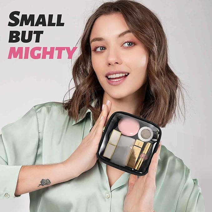 - COMPACT & PORTABLE DESIGN - Measuring 5.2 * 5.2 * 2 inches, this mini makeup bag is ideal for travel, fitting easily into any purse or travel makeup bag. This small, clear cosmetic bag keeps your essentials—makeup, skincare, lipstick, or sunscreen—organized and accessible. Versatile enough to serve as a cosmetic travel bag, makeup brush bag, or travel organizer
