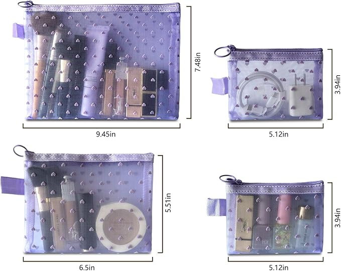 - ❤ DELICATE & ELEGANT: These mesh cosmetic bags are printed with many purple heart patterns, beautiful and charming, which will not make you feel bored. Besides, with zipper closure on the top, smooth and easy for you to open and close, can prevent items from falling out.