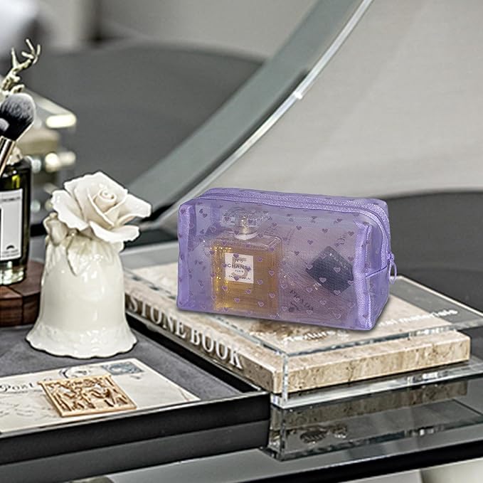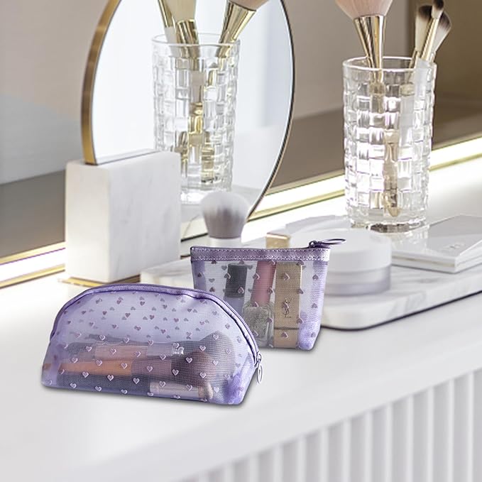 - ❤ DELICATE & ELEGANT: These mesh cosmetic bags are printed with many purple heart patterns, beautiful and charming, which will not make you feel bored. And they come in different shapes, like rectangular, triangle and semicircle, delicate and elegant.