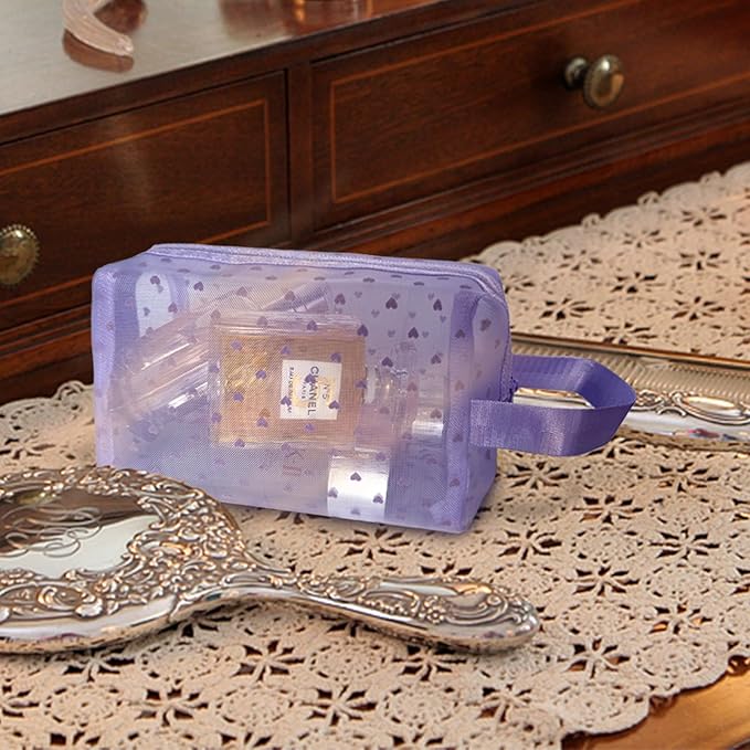 5-Piece Heart Printed Mesh Makeup Bag Set, Portable Travel Cosmetic Bags Toiletry Bags Purse Bags Makeup Bags Zipper Mesh Storage Pouches for Home Offices Travel Accessories (Purple)