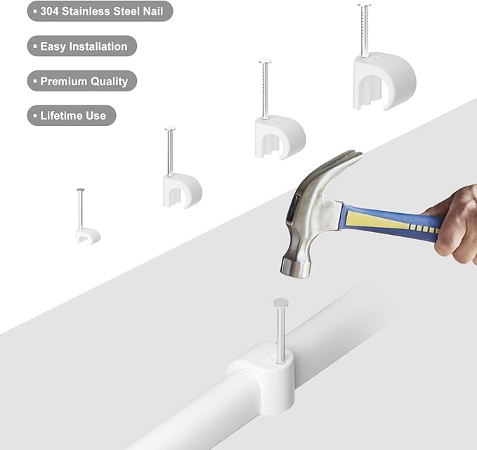 - Premium 304 Stainless Steel Nails: Each cable clip is equipped with high-quality 304 stainless steel nails that resist rust and corrosion, ensuring a secure hold on various surfaces for long-term use.
