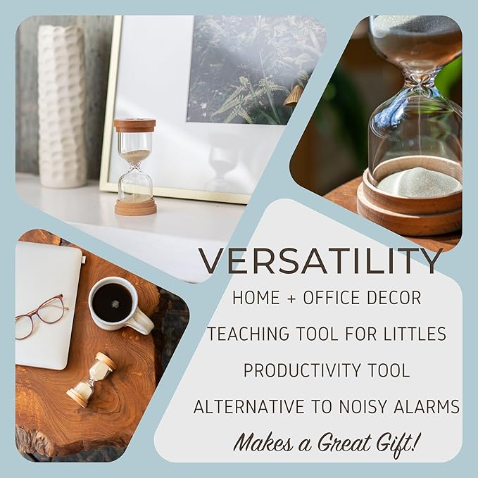 - โจModern Home Decor: When youโre not using the sand timer, it makes a beautiful, sleek and modern piece to elevate any space. Enjoy the natural simplicity of the design in your kitchen, office, living room, or classroom.