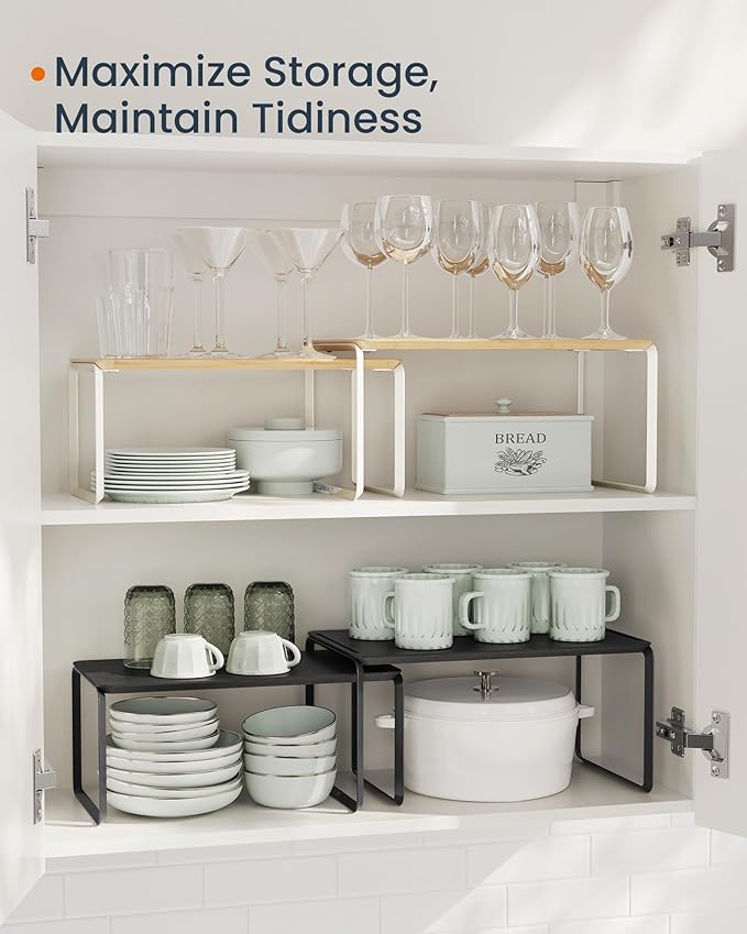 - 【STURDY CONSTRUCTION】Crafted from premium bamboo and steel, these cabinet organizers are built to last. The small rack holds up to 22 lb, while the large rack holds up to 24 lb, providing reliable support for your kitchen essentials