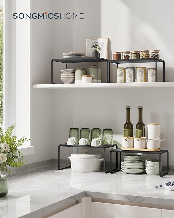 SONGMICS HOME Bamboo Cabinet Organizer Shelf, Nice-Looking Set of 2 Kitchen Counter Shelves, Kitchen Storage, Spice Rack, Stackable, Expandable, Ink Black UKCS050B01V1