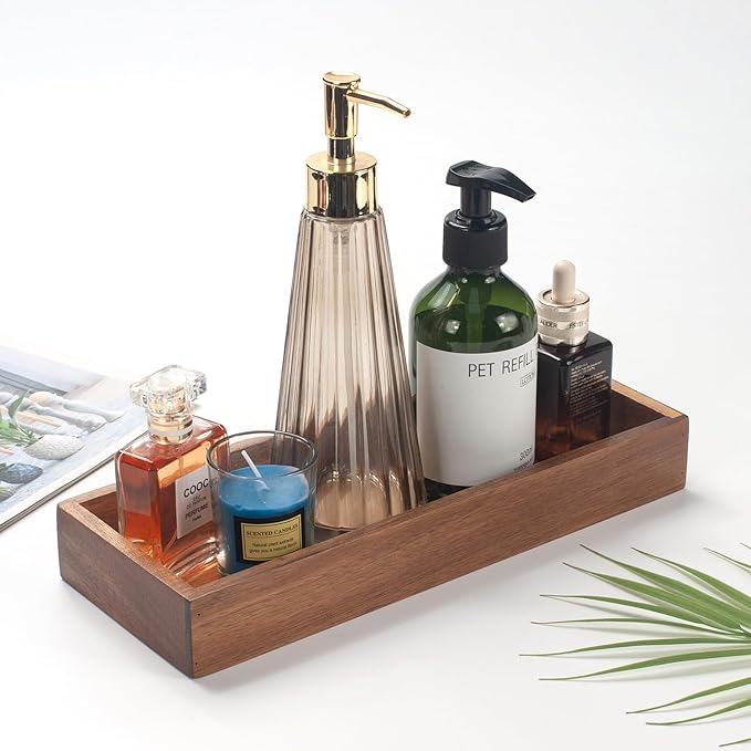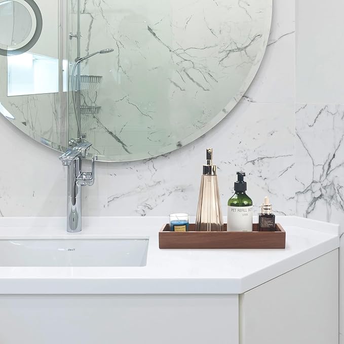 - Application: The wood tray is great to be vanity tray, bedside table tray, coffee table tray, entryway tray, bathroom storage tray, decorative tray. Suitable to set it on toilet tank top, vanity, dresser, nightstand, table, desk or shelf. Keep your items organized and within reach.