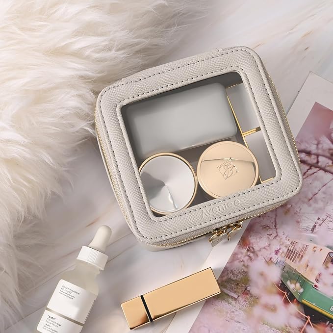 - ❤【LUXURY DESIGN】Unlike other flimsy clear makeup bags, our mini cosmetic case(measuring 5.2’*4.8’*2.6’) which made of premium saffiano PU leather and thick vinyl can keep a good structure and. The mini clear make up bag was designed into a minimalist boxy shape, crafted in beautiful PU leather and finished with polished hardware. Together with the beautiful stitches and whisper-quiet metal zippers, it’s durable for long-lasting use.