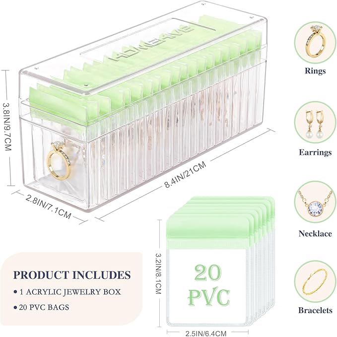 - ✅20 Portable PVC Pouches: The included 20 portable PVC jewelry bag are designed for durability and convenience. Their thick, transparent material resists tearing and securely seals to prevent jewelry from oxidizing. (Warm reminder: The size of the jewelry bag is 3.2 * 2.5 IN. For your shopping pleasure, please check whether the size of your jewelry is suitable.)