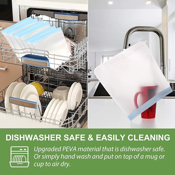 - 【Freezer Safe & Dishwasher Safe】 The freezer gallon bags can lock out freezer burn while keeping food fresh, perfect for freezing meat, chicken, fish, fruits, vegetables and as produce bags. Upgraded material makes it top rack dishwasher safe under 60℃/140℉. Find the area in the dishwasher where the highest temperatures and stay away from that area when you put it in the dishwasher. And we suggest hand wash and air dry to extend the lifespan of the reusable freezer bags. Not microwave friendly.