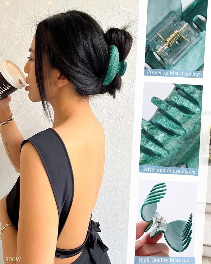 - 【ELEVATE UR LOOK】We’ve got 3 types of claw clips,translucent spotted, marble and glitter.What's more important is that each hair clip has undergone strict quality testing to ensure safe use and no harm to hair.Choosing our hair clips means choosing different confidence and beauty. Let our handmade hair clips accompany you through every beautiful moment