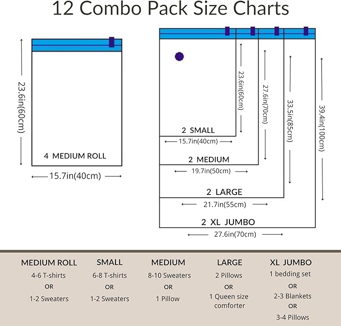 - 12 Combo Pack includes: 2 Jumbo, 2 Large, 2 Medium, 2 Small, 4 Medium Roll Up (Compression), Hand Pump