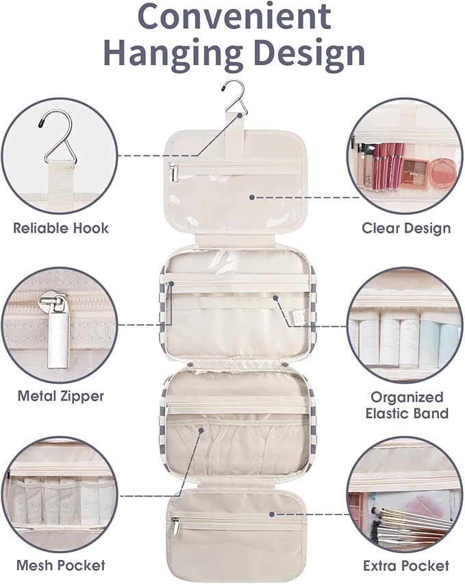 Narwey Travel Toiletry Bag for Women Large Hanging Makeup Bag Organizer Toiletries Bag for Full Size Essentials Accessories Cosmetics (Grayish Blue Checkerboard (Large))