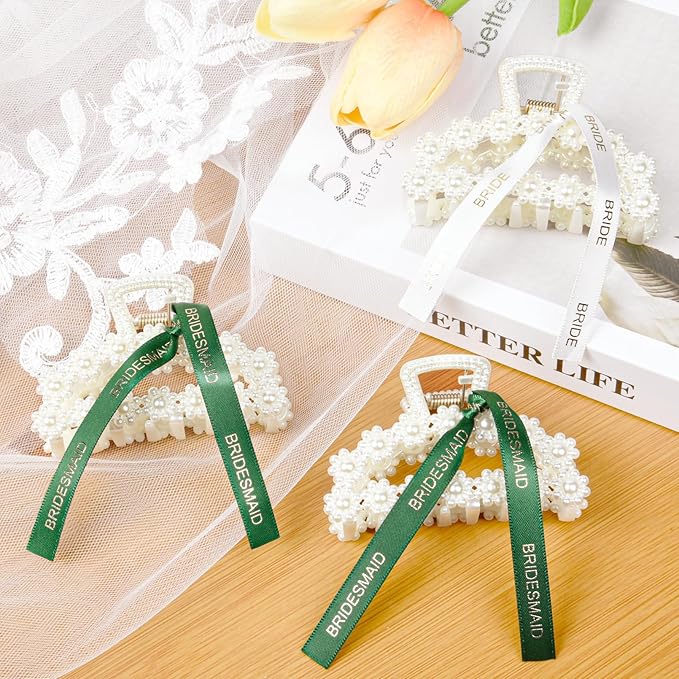 DEEKA Bridesmaid Proposal Gifts 8 Pack Pearl Bridesmaid Hair Claw Clips with Ribbon 3 Inch Hair Clips Bachelorette Party Favors Bridal Party Present Hair Accessories (Half Circle White&Dark Green)