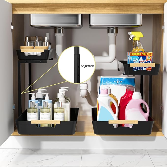 - The 3-level height adjustable design is a great design to store under sink organizer. The adjustable maximum space is sufficient to store most tall objects under sink storage for kitchen bathroom cabinet.