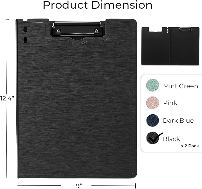 - Dimension - 12.4” W x 9”, you will receive 2 of black plastic clipboard. Each metal clip can hold approximately 70 sheets of A4 or Letter Size paper