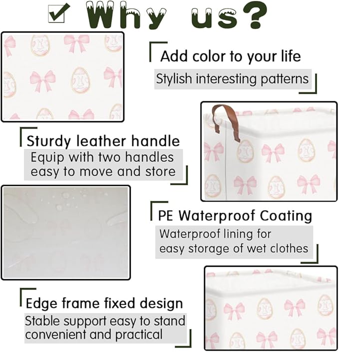 FXOLCSHE Rectangular Easter basket,Nursery Hamper,Collapsible waterproof baby toy storage box for Kids,Toy Organizer,Home Decor,Easter gift basket(Pink bow egg)