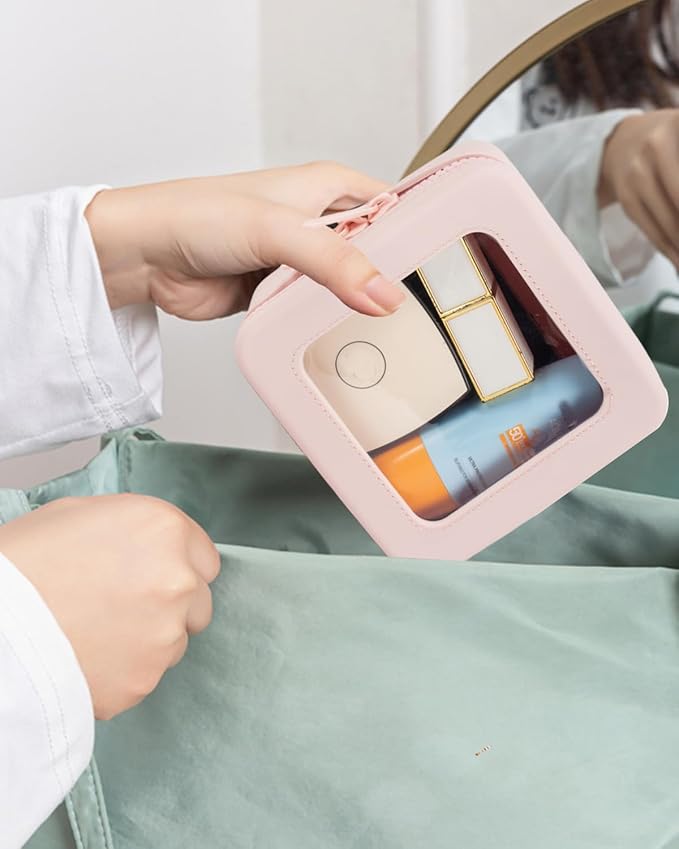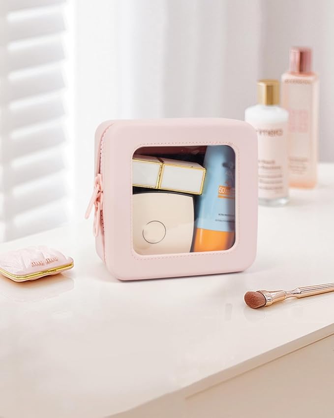 - Clear Design: The clear travel makeup bag designed in a minimalist boxy shape,is sleek and minimalistic look for your makeup accessories collection. And is designed with a transparent PVC window,all items are clear at a glance, and you can quickly choose the cosmetics you need. Size:5.1'' x 5.1''x 2''