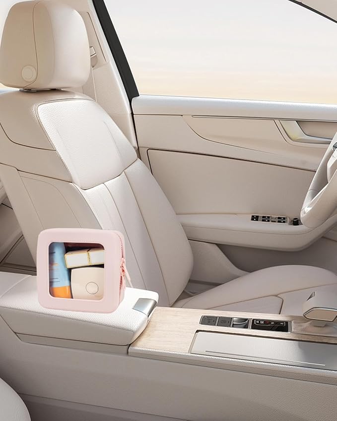 - Car Must Have Essential: Our car essentials small pouch travel toiletry bag is roomy to store your makeup brushes, lipstick, eyebrow pencil, make-up foundation, cables, chargersor and other little items.It make your daily make-up, cream, lipstick, perfume and other beauty things organized and protected.This clear mini toiletry bag can be a good car accessory fits in the center console or other parts of your car