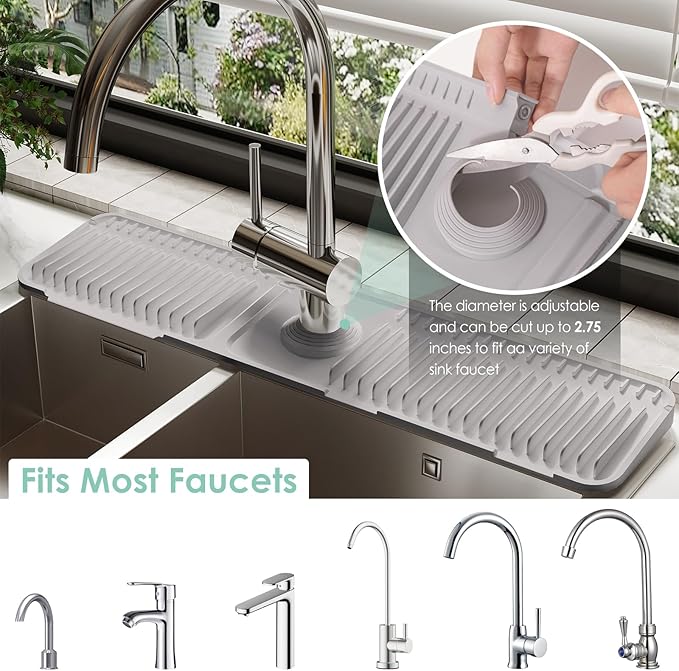 - Customizable Hole & Button DesignοΌOur faucet draining mat features a customizable hole design, allowing you to trim it for a perfect fit. The unique button design keeps the mat securely in place, preventing gaps and keeping your sink dry and clean. This silicone sink splash guard offers a leak-proof, no-slip fit, providing protection and convenience for your kitchen!