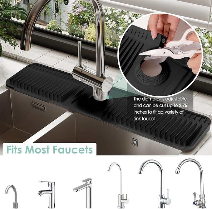 - Customizable Hole & Button DesignοΌOur faucet draining mat features a customizable hole design, allowing you to trim it for a perfect fit. The unique button design keeps the mat securely in place, preventing gaps and keeping your sink dry and clean. This silicone sink splash guard offers a leak-proof, no-slip fit, providing protection and convenience for your kitchen!