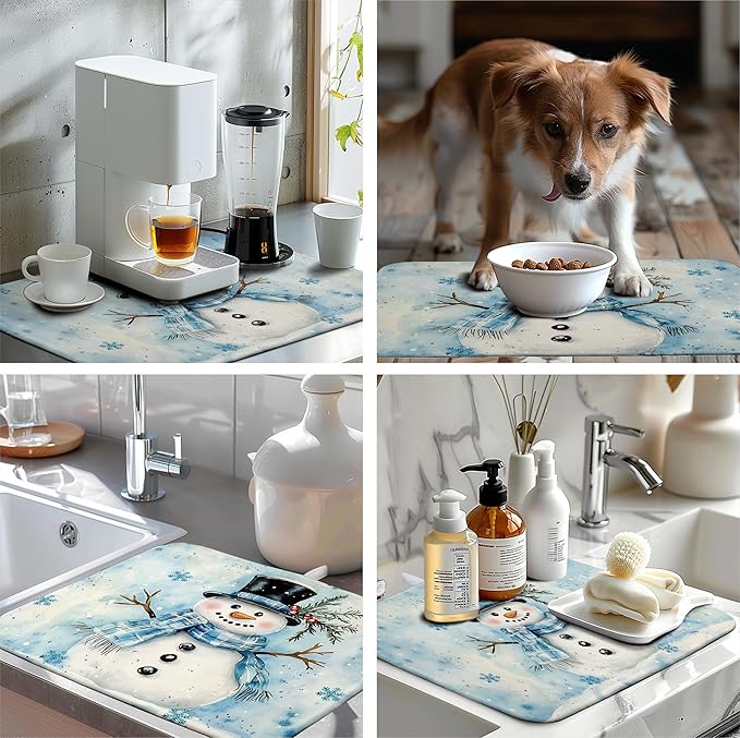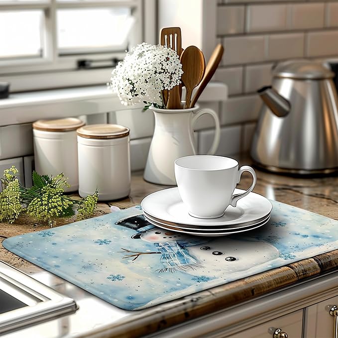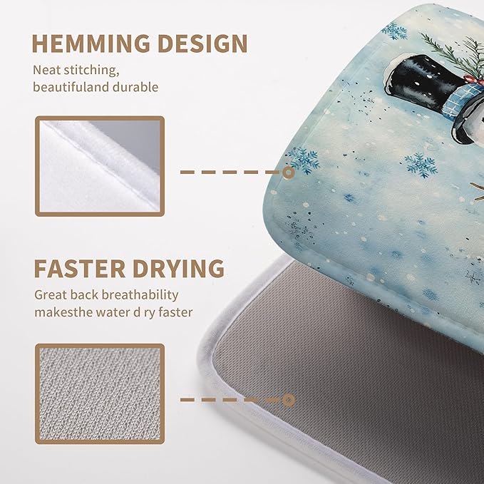 - [Super Absorbent]: Winter blue snowman dish mat drying kitchen mat surface is a super absorbent microfiber and the middle is a composite sponge that can absorb water equal to 4 times its weight. A dry dish mat can always keep your kitchen clean and tidy, giving you a more comfortable cooking space