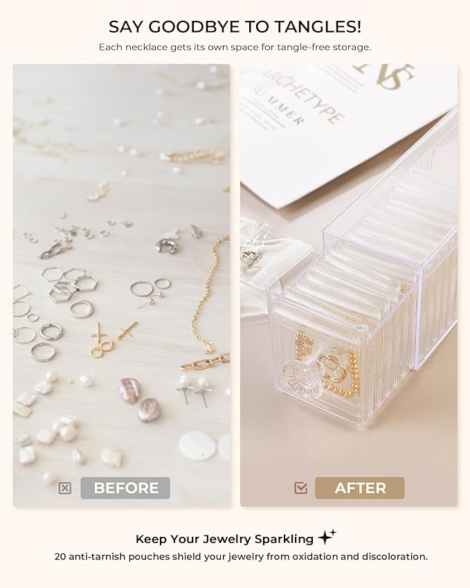 - ✅20 Clear PVC Pouches for Tangle-Free, Protected Storage : Included with this clear jewelry organizer are 20 clear PVC pouches designed to keep your jewelry tangle-free and well-protected. Each pouch is perfect for storing necklaces, rings, earrings, and other small accessories. The clear material allows for easy visibility, while the protective pouches help guard your jewelry from dust, dirt, and potential oxidation, ensuring it stays in top condition.