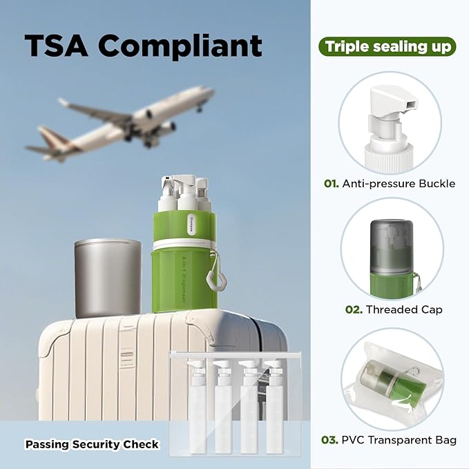 - >Leak Proof Travel Bottles: The dispenser bottle has a built-in anti-squeeze clip to prevent accidental squeeze and leakage; the 4-in-1 integrated design creates a seal when the mouthwash cup is tightened; and the transparent pouch provides extra protection and is TSA compliant.Triple protection allows you to say goodbye to liquid leakage worries, perfect for travel, hassle-free flights and gym trips!