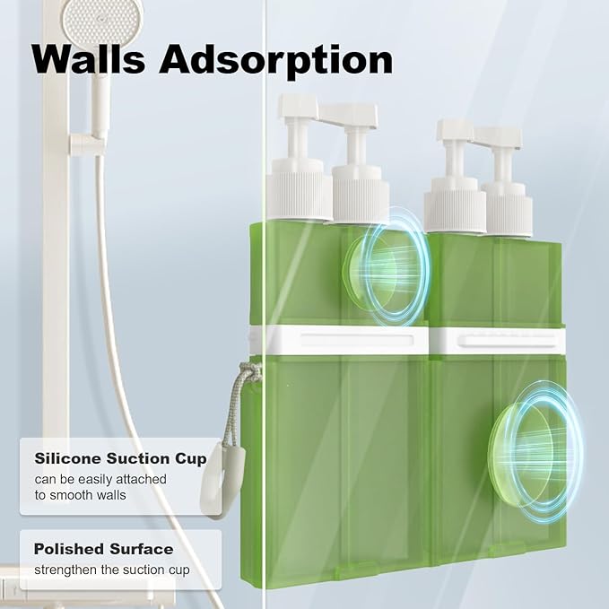 YOTIME 4in1 Travel Bottles Set, Vacuum Silicone Suction Cup for Smooth Walls, TSA Approved Leak Proof Travel Size Containers for Toiletries, Shampoo, Body Wash and Conditioner, Green