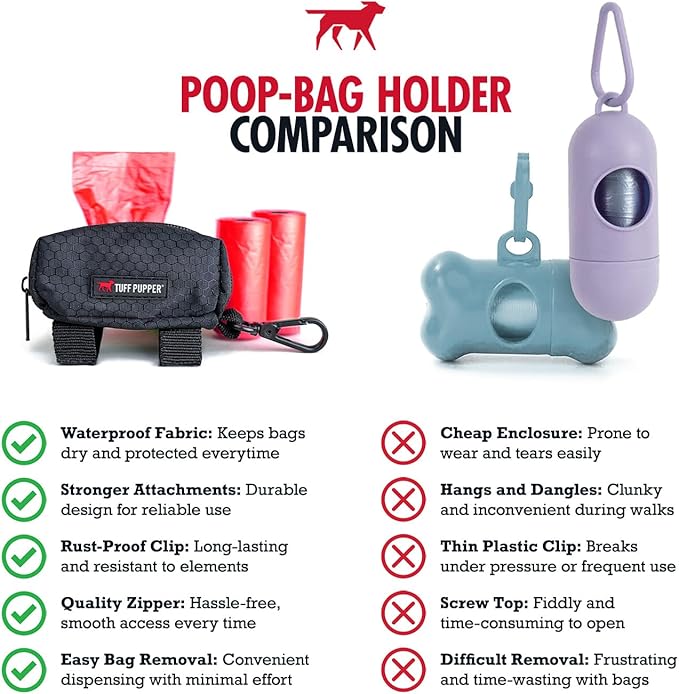 Tuff Pupper Dog Poop Bag Holder | Works with Any Dog Leash | Zippered Waste Bag Dispenser | Waterproof with Rust-Proof Clip | Convenient Lightweight Design | Includes 2 Rolls of Leak-Proof Bags