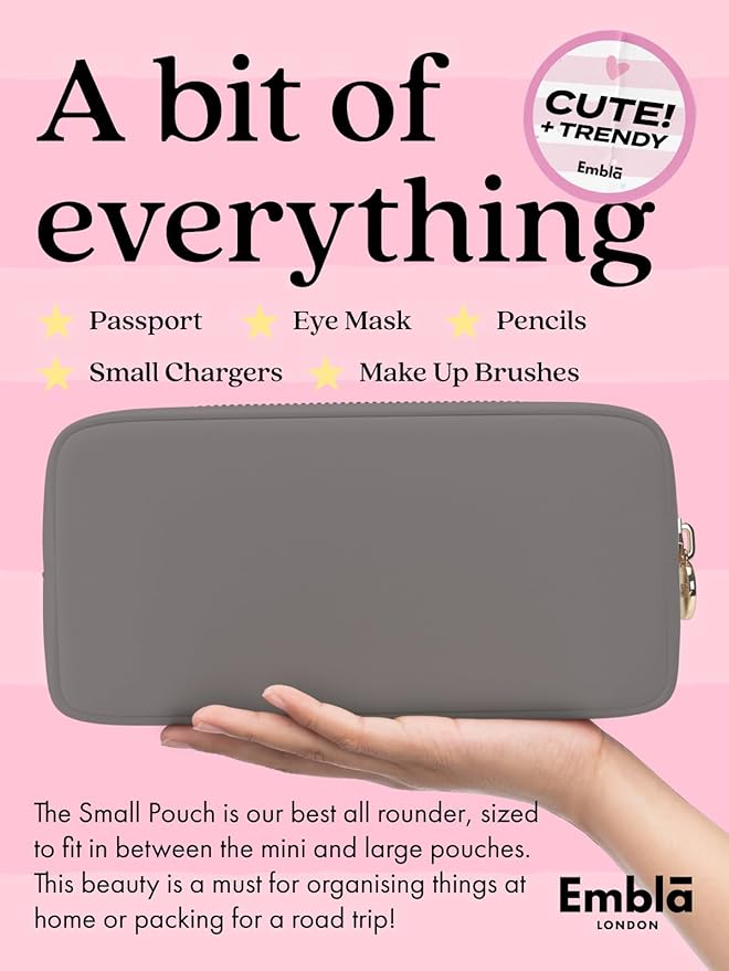 - TRAVEL + CUTE = EMBLA! - Our bags are THE trendy & preppy storage gifts! Simply pick your size (Mini, Large or XL) and start organizing all of your makeup, lipstick, hair stuff, snacks and jewelry accessories! Or use it as a clutch handbag, makeup brush holder, skin care bag, zippered carry case or coin purse wallet!