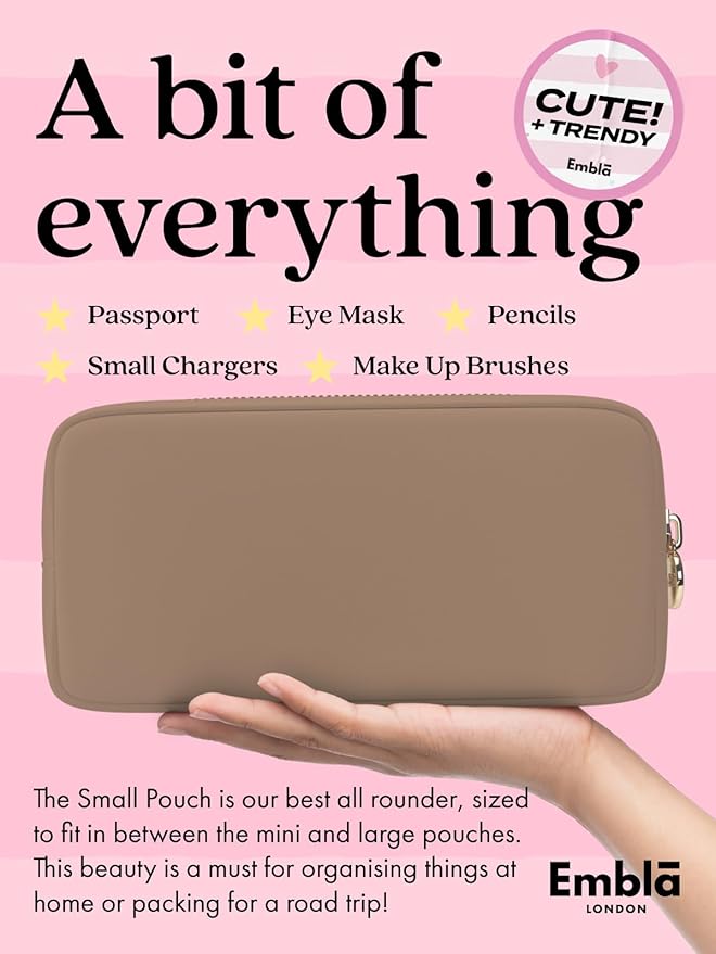 - TRAVEL + CUTE = EMBLA! - Our bags are THE trendy & preppy storage gifts! Simply pick your size (Mini, Large or XL) and start organizing all of your makeup, lipstick, hair stuff, snacks and jewelry accessories! Or use it as a clutch handbag, makeup brush holder, skin care bag, zippered carry case or coin purse wallet!