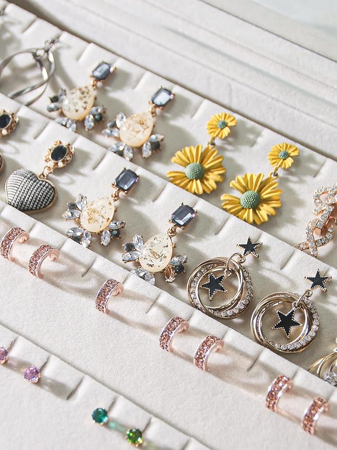 - This earring organizer tray box is made of solid wood inside and surface wrapped with soft beige velvet to protect your jewelry from friction and dust. The top of the jewelry display case comes with a instead of plastic lid